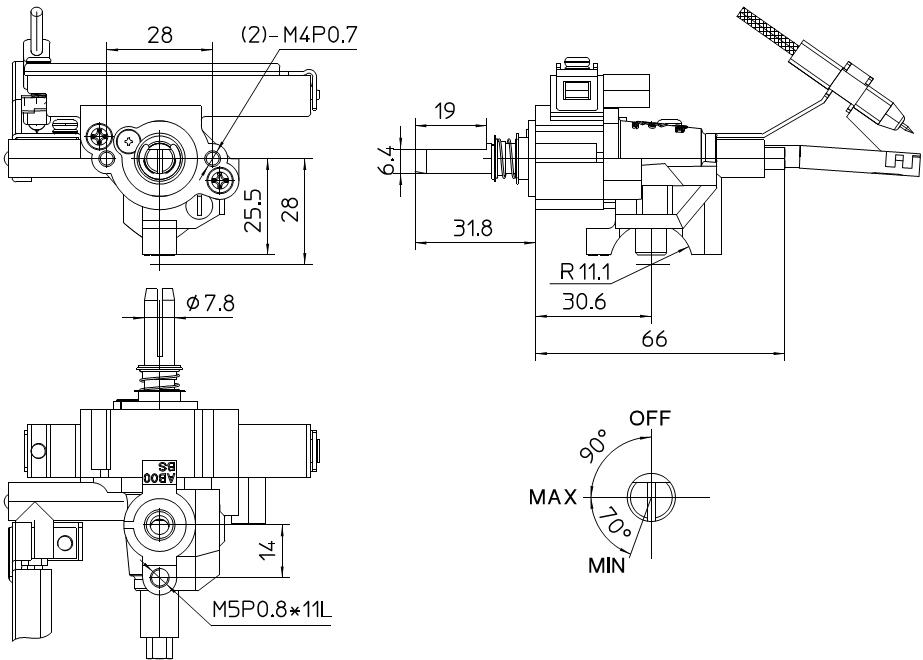 0 degree Aluminum valve CSA&CE certification Max working pressure:1/2psi (3.5KPa) Working temperature range:32゚F-225゚F With piezoelectric Ignition With low flame adjustment function(LP-NG convert) Manifold diameter: R8 & R11