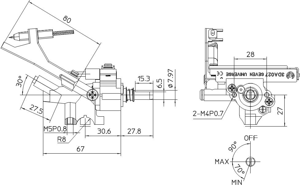 30 degree Aluminum valve CSA&CE certification Max working pressure:1/2psi (3.5KPa) Working temperature range:32゚F-225゚F With piezoelectric Ignition With low flame adjustment function(LP-NG convert) Manifold diameter: R8 & R11